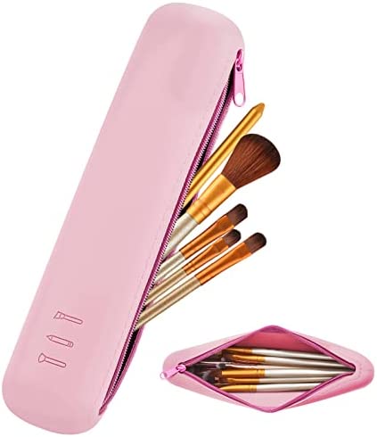 Upgrade with zipper Trendy Makeup Brush Holder, Soft and Silky Silicone Cosmetic Brush Box, Trendy and Portable Cosmetic Face Brushes Tools Organizer for Travel. (Pink)