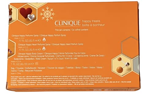 Clinique Limited Edition Happy Treats 4 Piece Gift Set. Set Includes: Clinique Happy Perfume Spray (0.17 fl oz/ 5 ml), Clinique Happy Heart Perfume Spray (0.17fl oz / 5ml), Clinique Happy Body Cream (1 fl oz / 30 ml), Bag