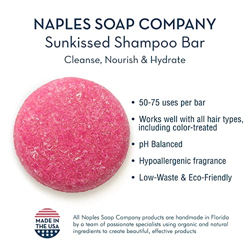 Sunkissed Shampoo Bar: Sodium Coco Sulfate, Lemon Juice, Powdered Lemon Peel, Cocoa Butter, Coconut Oil, Hypoallergenic Fragrance, Red Raspberry Seed Oil, Pro Vitamin B Complex, FD&C Color
