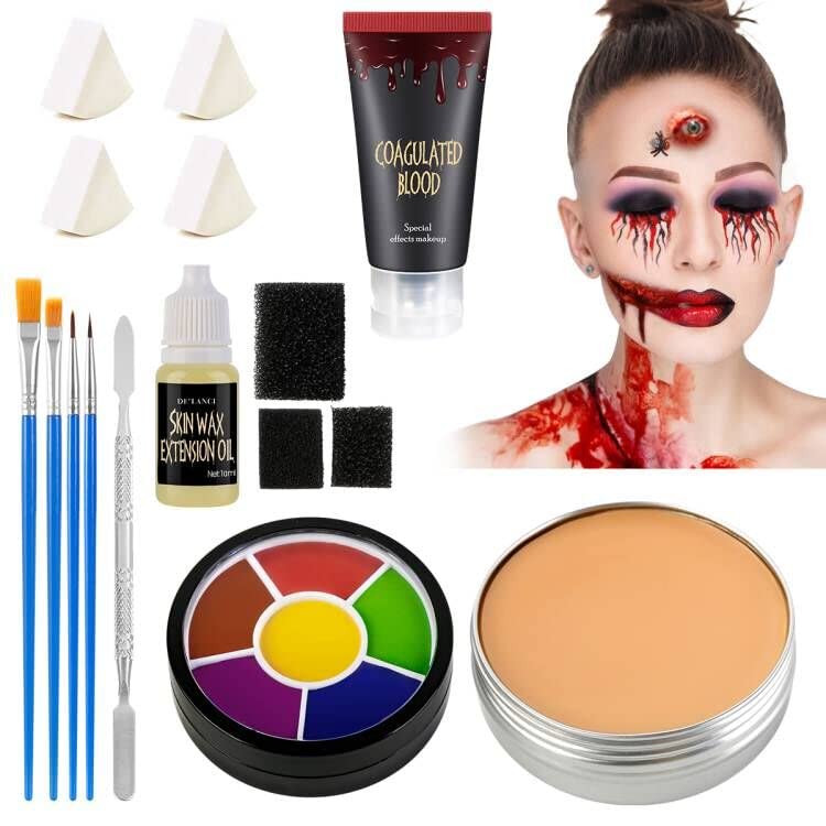 SFX makeup kit supplies Package Included: 16 kits Color: Scar wax for light-skin 60g Wax Spatula: 15×0.7cm Coagulated Blood: 30g Stipple Sponges: 3pcs ,different hole for each Skin wax extension oil: 10ml Neon Body face painting glow in dark 12 colors Makeup brush 4 pcs. Perfect SFX Halloween makeup kit packing